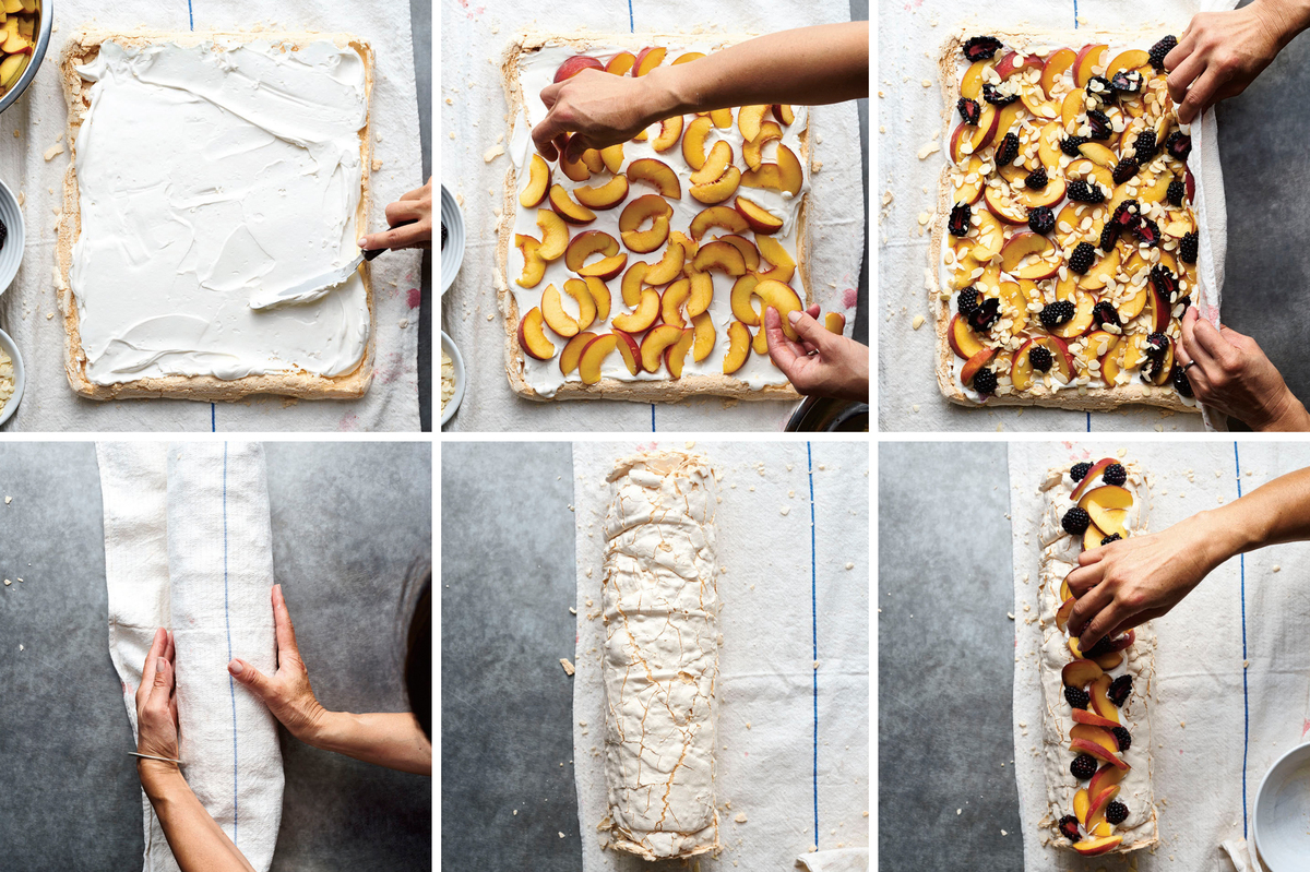 Step by step visual instructions for rolling the pavlova with peaches and blackberries. We use plums instead of peaches for our holiday version.